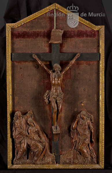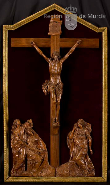 Se trata de un hermoso relieve destinado en su día al retablo de una capilla funeraria; su temática se inserta además en una disposición espacial cercana al remate, copete o colofón del correspondiente retablo. Calvario, además, que presenta unas características formales más cercanas al academicismo francés de los siglos XVII y XVIII que a cualquier tendencia, escuela u obrador peninsular. Una firma con tinta realizada en el reverso de la tabla – “ADAM ESCULPTEUR”- nos remite a la figura de Lamberto Adam (1700-1759) artista francés, alumno de la Academia de París, orientado a la gran escultura decorativa (“Neptuno y Anfítrite” de Versalles o su participación en el proyecto de una de la Fuente de Tréveris). En su día el Cardenal Polignac le encargó, junto a otros artistas, la restauración de varias obras procedentes de la antigüedad clásica. En el año 1737 ingresó en la Academia de Roma, lugar en el cual desarrolló gran parte de su actividad artística.
