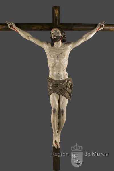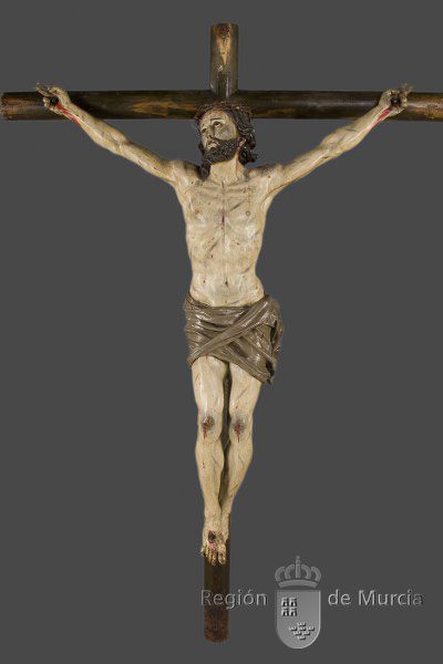 La obra que nos ocupa es una espléndida escultura de Cristo Crucificado de gran tamaño que plasma una de las iconografías más importantes dentro de nuestra tradición religiosa, cual es el momento previo a la expiración. Sobre un madero y sujeto mediante tres clavos, la figura de Cristo expresa un profundo y contenido dramatismo, no exento de las particularidades propias en cuanto a aspectos descriptivos, sin olvidar los puramente contemplativos. Bellísimo cuerpo apolíneo lacerado, rostro de intensa belleza en un gesto suplicante…..Acapara, en definitiva, todos aquello resortes que hoy pudieran resultar banales y que fueron concebidos y pergeñados para ser objeto de fervor religioso. Esta obra se halla inscrita en aquellos parámetros del decoro estético y dramático que de manera tan lograda hacían funcionar Salzillo y sus discípulos. Procede de la Iglesia de San Juan Bautista de Murcia.