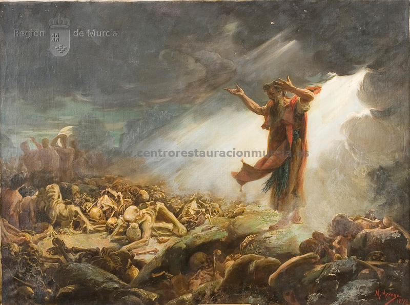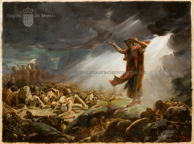 La obra perteneciente a los fondos del Museo de Bellas Artes de Murcia, La visión de Ezequiel, es un boceto, un elemento integrante, de un conjunto o sistema decorativo de mayor envergadura, en donde el artista resuelve el problema espacial a través de veladuras y celajes reforzado por un estudio anatómico de gran vigor. Como es sabido, la obra definitiva se instaló en el Cementerio de Linares pero ésta asume los registros dramáticos y de tramoya tan característicos en su producción.