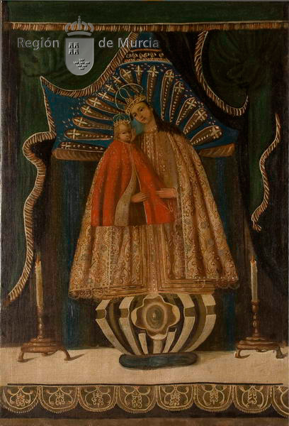 Este lienzo, enmarcado en sencilla moldura de pino, es un bocaporte de camarín cuya representación responde a las características de trampantojo. Se plasma en primer término la propia imagen de la Virgen con el Niño sobre una peana e insertada en un espacio ilusionístico donde destacan una venera de fondo, el altar cubierto de paño blanco, dos candeleros, etc..El esquema compositivo, así como las calidades técnicas responden a arquetipos arcaizantes existiendo un intento en manifestar la veracidad de volúmenes y policromías.