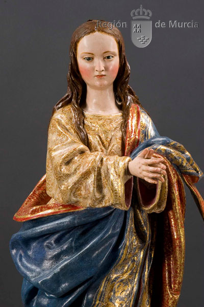 La obra que nos ocupa entronca con la iconografía que hacia la mitad de la centuria Alonso Cano diseña para la Sacristía de la Catedral de Granada, perteneciendo al repertorio difundido por Alonso de Mena cuyas peculiaridades se centran en la exquisitez de formas y policromías, así como en su pequeño formato. La Virgen está contemplada con una impronta casi infantil y un sutil gesto donde destacan el perfecto tratamiento de rasgos y cabello. A la forma ahusada de la silueta contribuye la distribución de pliegues del manto, con un tratamiento perfeccionista en el tallado de planos, unas veces angulosos y contundente, otras, delicadamente mórbidos. Pero el artífice de esta obra despliega una fastuosidad inusitada en las policromías y estofas de tejidos; éstas últimas se centran en la blanca túnica totalmente brochada en oro y en el manto azul purísima de forro carmesí por el que bordea una gran cenefa dorada de cartelas, cuyas tornapuntas en “C” cobijan los símbolos de la Letanía.
