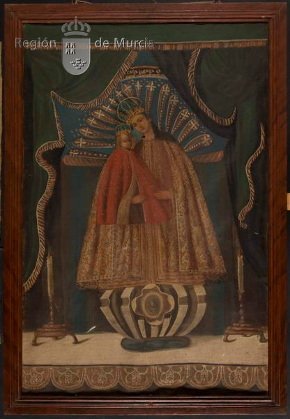 Este lienzo, enmarcado en sencilla moldura de pino, es un bocaporte de camarín cuya representación responde a las características de trampantojo. Se plasma en primer término la propia imagen de la Virgen con el Niño sobre una peana e insertada en un espacio ilusionístico donde destacan una venera de fondo, el altar cubierto de paño blanco, dos candeleros, etc..El esquema compositivo, así como las calidades técnicas responden a arquetipos arcaizantes existiendo un intento en manifestar la veracidad de volúmenes y policromías.