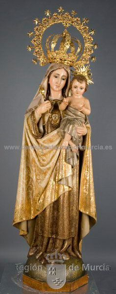 Iconográficamente se representa a María como Madre, llevando en brazos al Niño Jesús (en la obra que nos ocupa el niño está desaparecido), y portando la Virgen el escapulario, símbolo del hábito carmelitano y de la salvación eterna, y cubierta por un manto que simboliza la protección de María a la Orden. La obra está vestida con túnica marrón y escapulario, decorada con incisiones doradas, como corresponde a la patrona del Carmelo, y envuelta por un amplio manto de tono claro adornado con flores. La cabeza cubierta con un velo. El nombre del Carmen viene del Monte Carmelo o “viña de Dios” que está en Tierra Santa. Según el Libro de los Reyes, allí vivió el Profeta Elías con un grupo de jóvenes, dedicados a la oración. Corría el año 300 a J C, y una gran sequía asolaba la región; el Profeta subió a la montaña para pedir lluvia y divisó una nube de luminosa blancura de la cual brotaba el agua en abundancia; comprendió que la visión era un símbolo de la llegada del Salvador esperado, que nacería de una doncella inmaculada para traer una lluvia de bendiciones. Desde entonces, aquella pequeña comunidad se dedicó a rezar por la que sería madre del Redentor, comenzando así la devoción a Nuestra Señora del Carmen (o Carmelo). En el Siglo XIII: su Superior, San Simón Stock estaba en oración, preocupado por nuevas persecuciones, cuando se le aparece la misma Madre de Dios para decirle:”amadísimo hijo, recibe el escapulario de mi orden para que quien muriese llevándolo piadosamente, no padezca el fuego eterno”. El Papa Gregorio XIII declaró verdadera esta aparición después de serios estudios, y basándose en los favores que recibían los que usaban el escapulario. También fue reconocida esta aparición por el Papa Juan XXII, que recibió una nueva aparición de la Virgen, en la que prometía sacar del purgatorio el primer sábado después de su muerte a sus devotos.